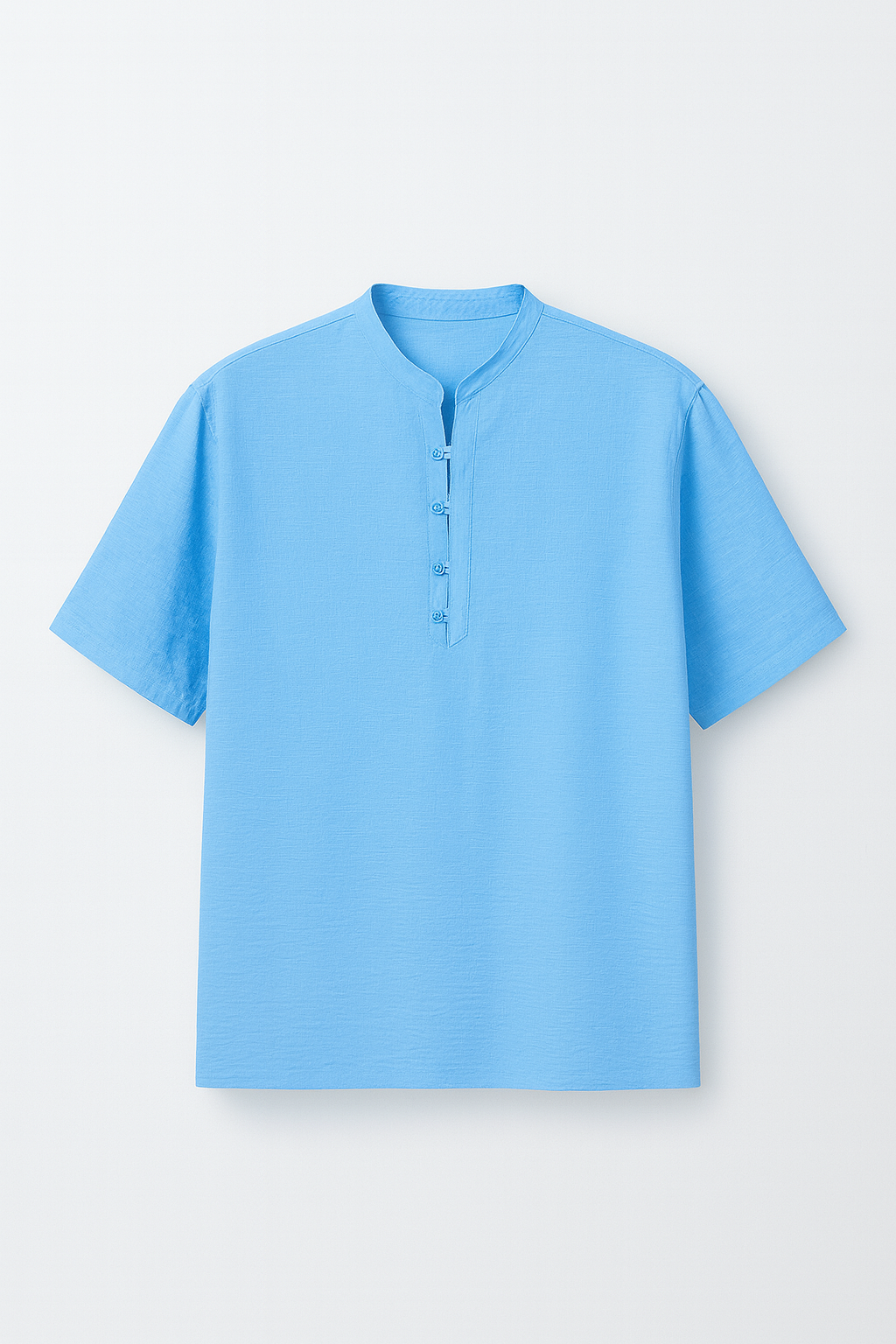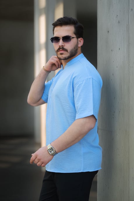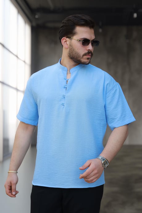 Wes Oversize Yarım Pat Bambu Kısa kol Gömlek - Açık Mavi