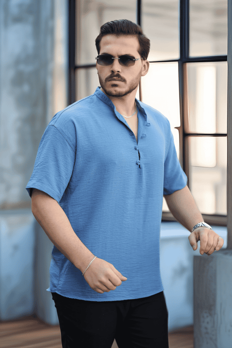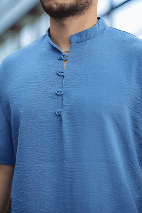 Wes Oversize Yarım Pat Bambu Kısa kol Gömlek - Mavi