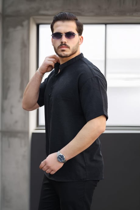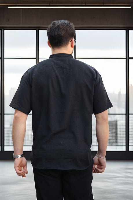 Oversize Yarım Pat Bambu Kısa kol Gömlek - Siyah