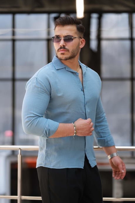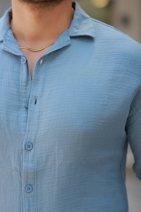Apaş Yaka Oversize Müslin Kumaş Gömlek - Soğuk Mavi