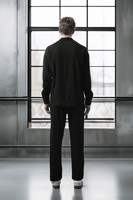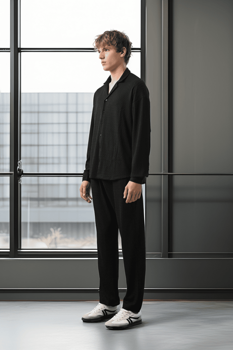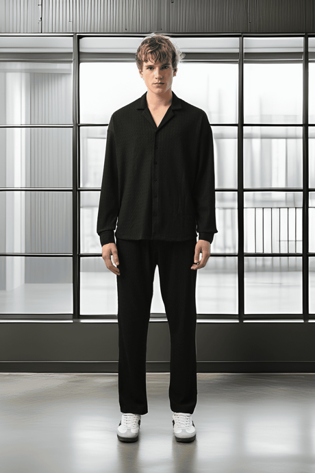 Apaş Yaka Uzun Kol Gölge Dokulu Gömlek - Siyah