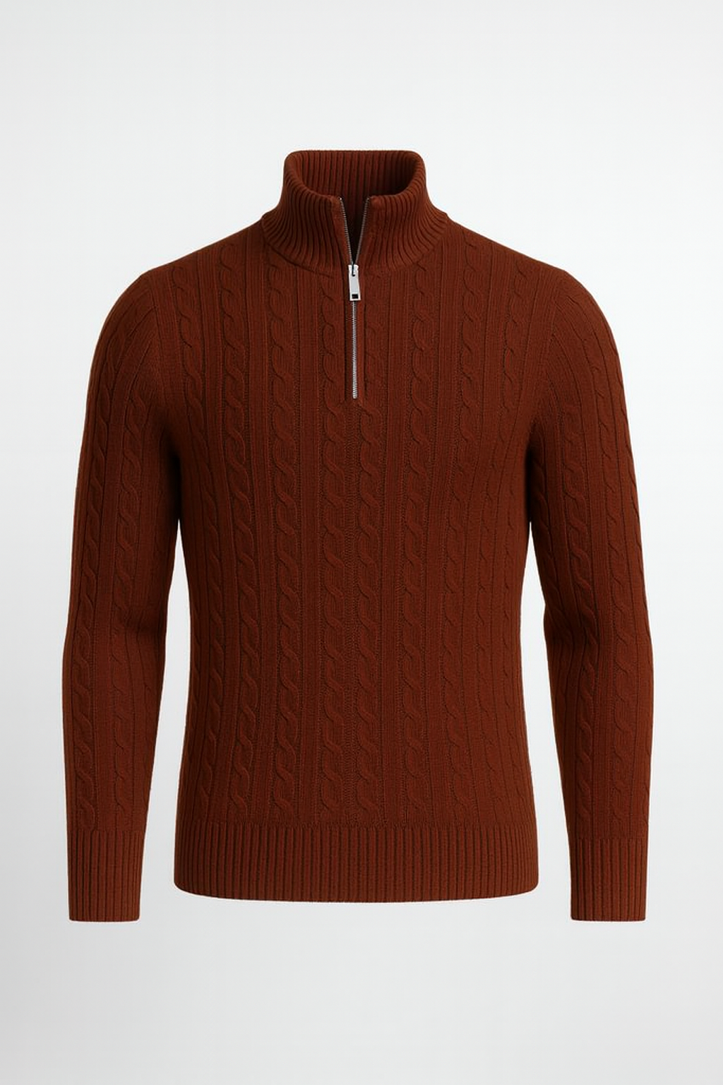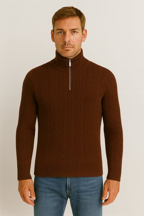 Bardem Saç Örgülü Yarım Fermuar Erkek Triko Kazak - Kahve