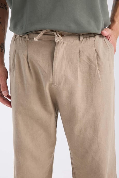 Bergman Keten Görünümlü Pamuklu Flamlı Rahat Kalıp Pileli Erkek Pantolon - Kum Beji