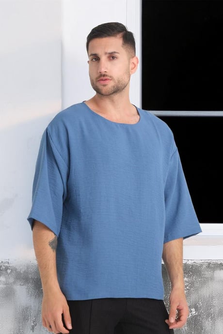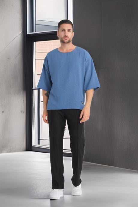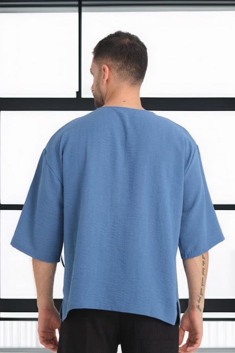 Bisiklet Yaka Fakir Kol Oversize Kısa Kol T-shirt - Mavi