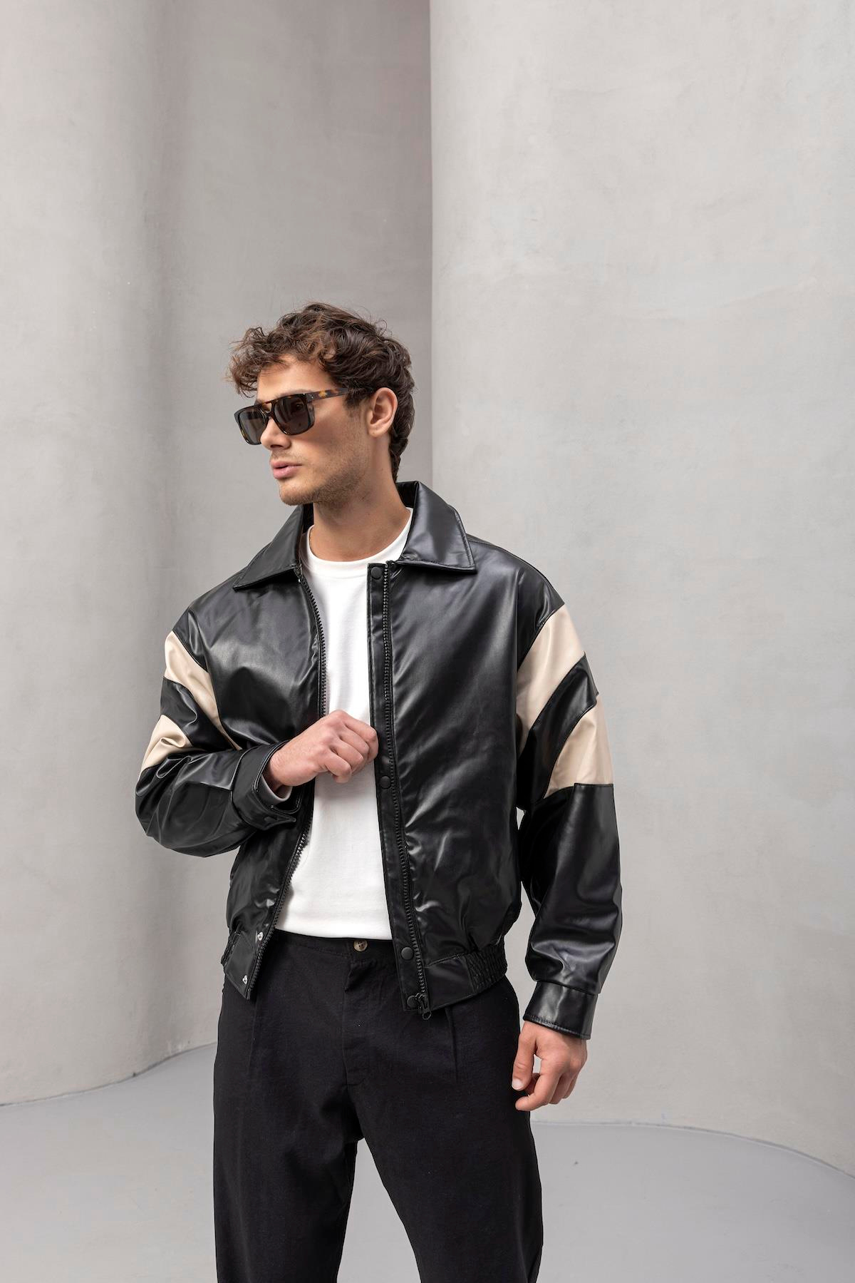 Burton Kolları Garnili Çıtçıtlı Fermuarlı Deri Görünümlü Erkek Ceket - Ekru Siyah