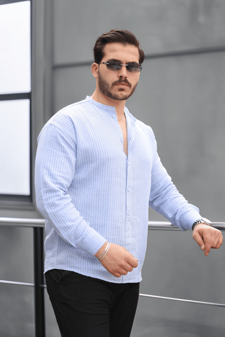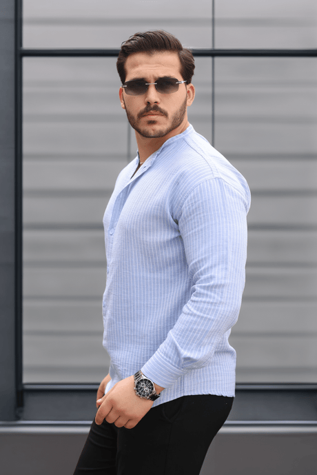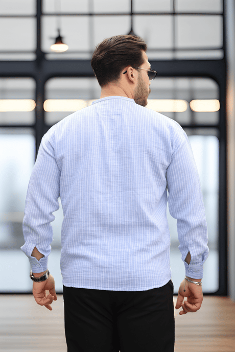 Çizgili Müslin Kumaş Yarım Pat Erkek Gömlek - Mavi