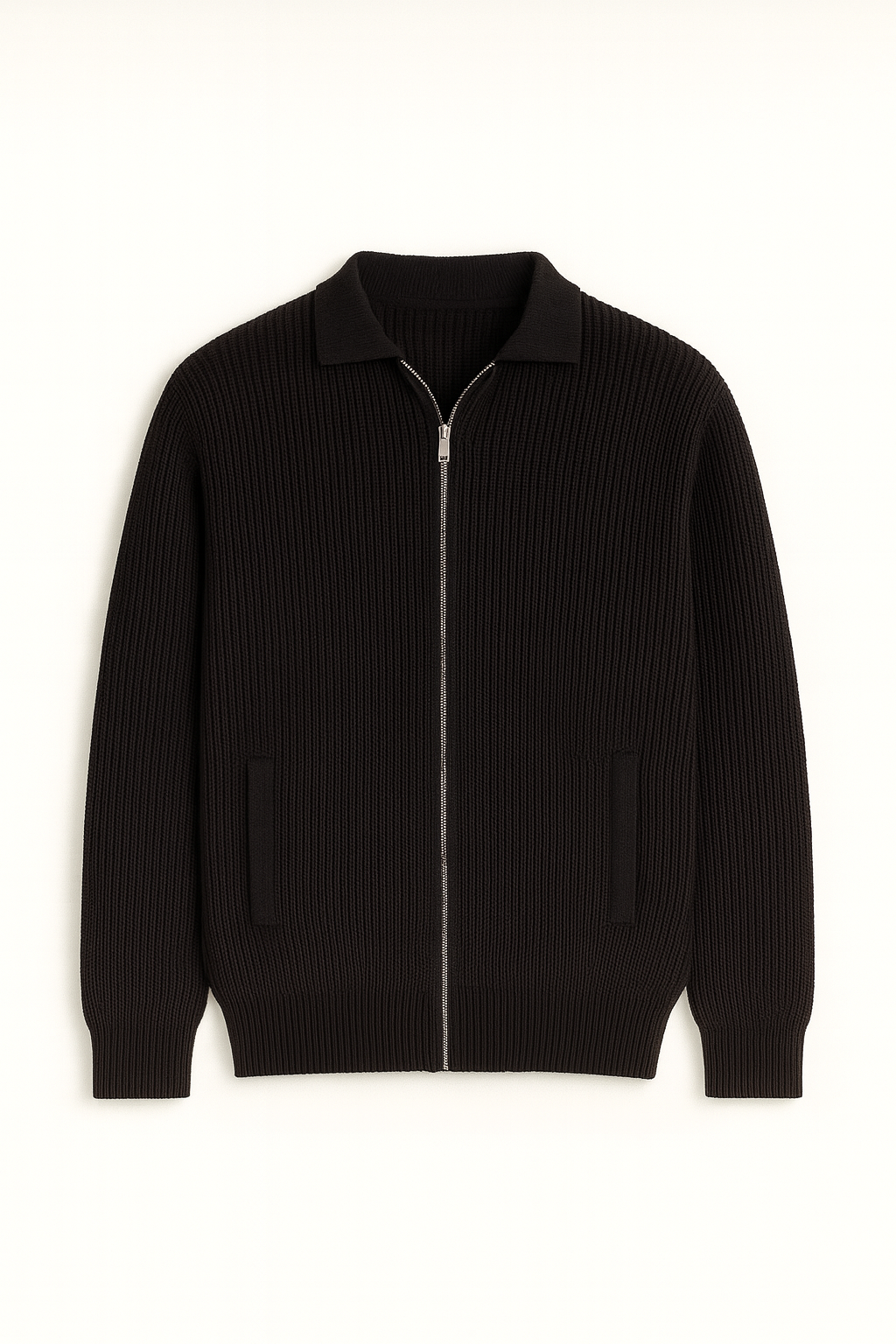 Coppola Selanik Örgü Polo Yaka Cepli Fermuarlı Rahat Kalıp Erkek Triko Hırka - Siyah