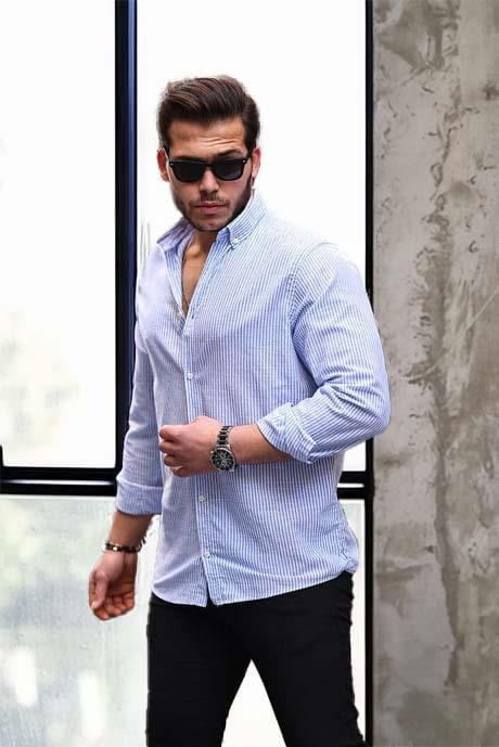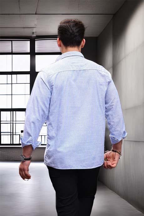 Dik Şerit Çizgili Flamlı Pamuk Gömlek - Mavi