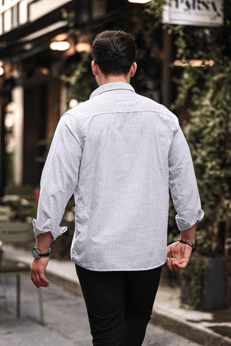 Şık ve Modern Dik Şerit Çizgili Flam Keten Gömlek Bu keten gömlek, dik şerit çizgili tasarımıyla öne çıkıyor. Zarif detayları ve özel flam dokusuyla dikkat çeken bu gömlek, şıklığı ve rahatlığı bir arada sunuyor. Gardırobunuzun vazgeçilmezi olmaya aday olan bu gömleği keşfedin!