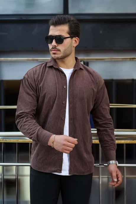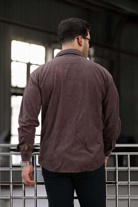 Oversize Fitilli Erkek Kadife Gömlek - Kahve