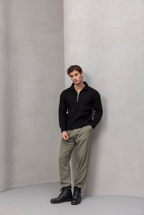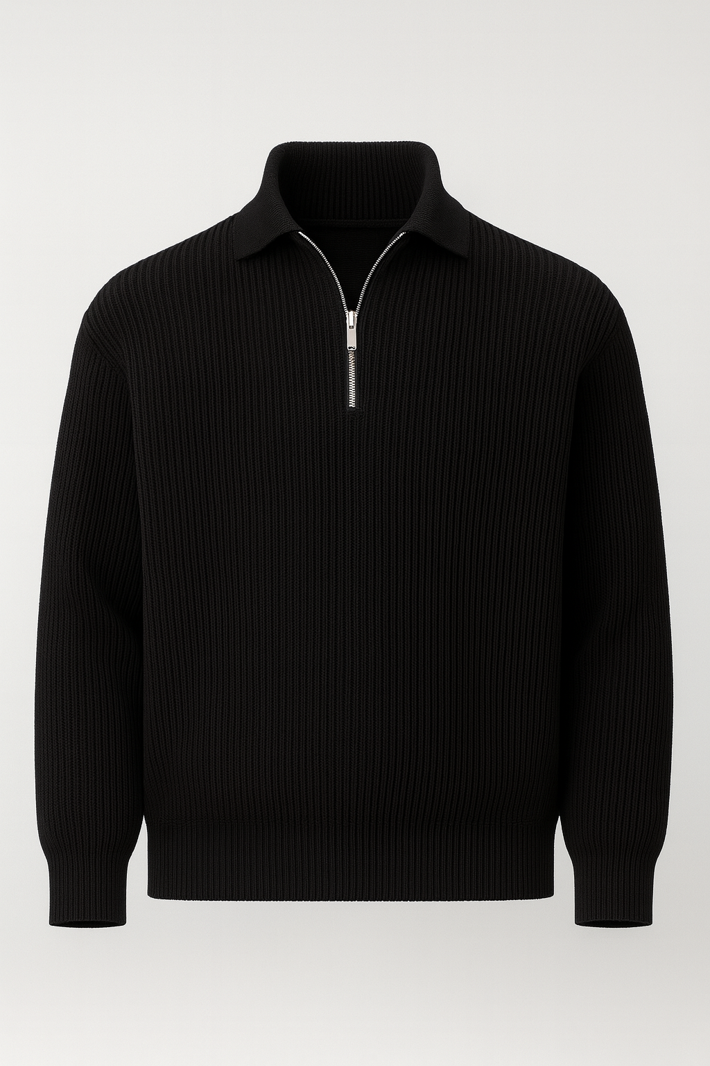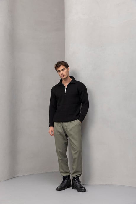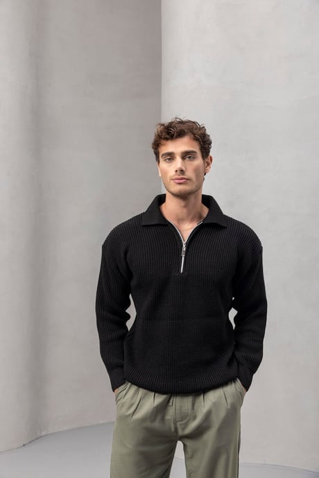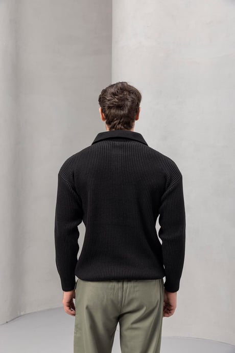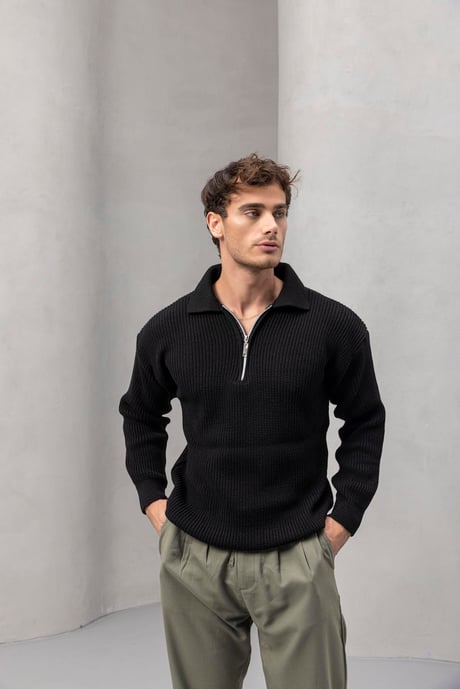 Gibson Oversize Yarım Fermuar Gömlek Polo Yaka Selanik Örme Erkek Triko Kazak - Siyah