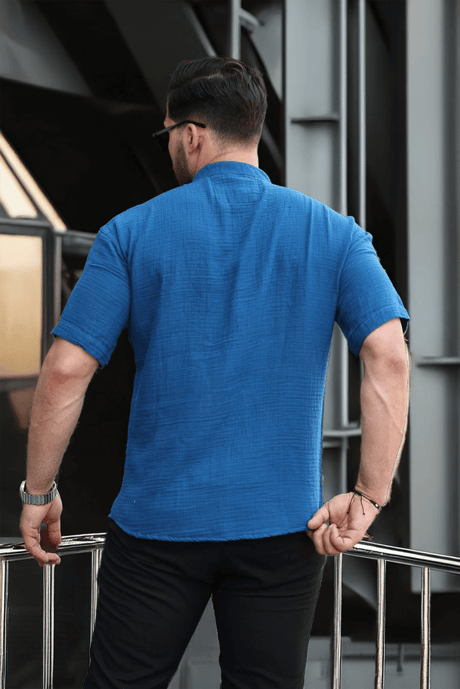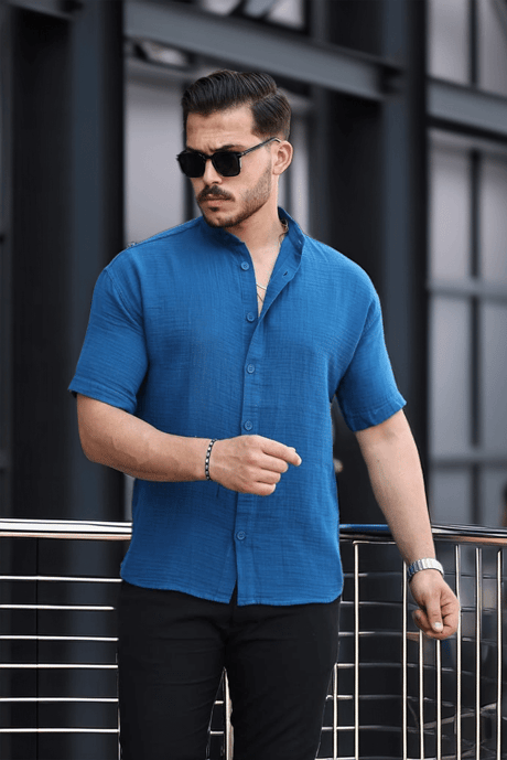 Hakim Yaka Müslin Kumaş Kısa Kol Gömlek - İndigo