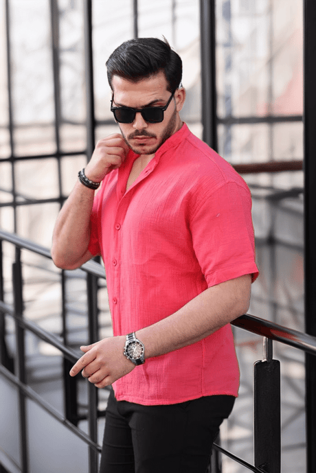 Hakim Yaka Müslin Kumaş Kısa Kol Gömlek - Nar