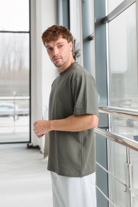 İki İplik Kumaş Pamuklu Bisiklet Yaka Basic Oversize Erkek T-Shirt - Avcı Yeşili