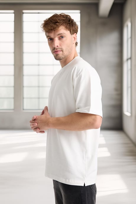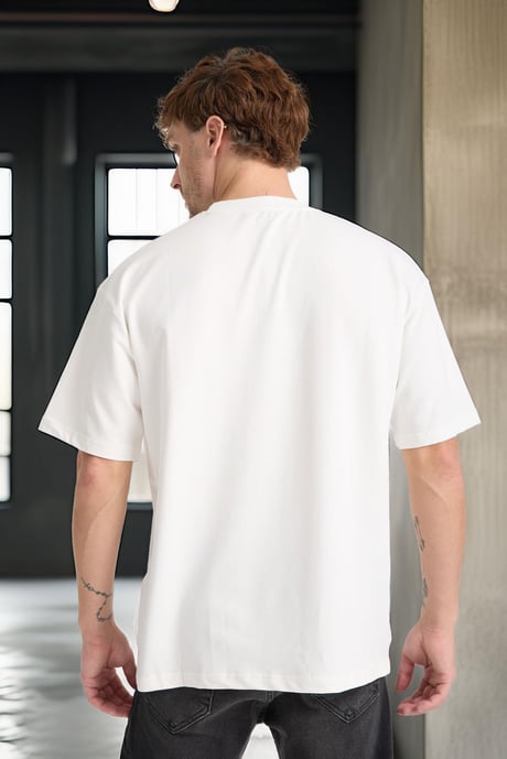 İki İplik Kumaş Pamuklu Bisiklet Yaka Basic Oversize Erkek T-Shirt - Ekru