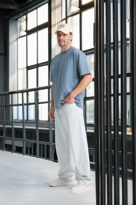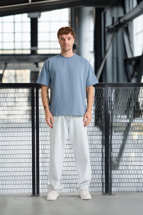 İki İplik Kumaş Pamuklu Bisiklet Yaka Basic Oversize Erkek T-Shirt - Soğuk Mavi