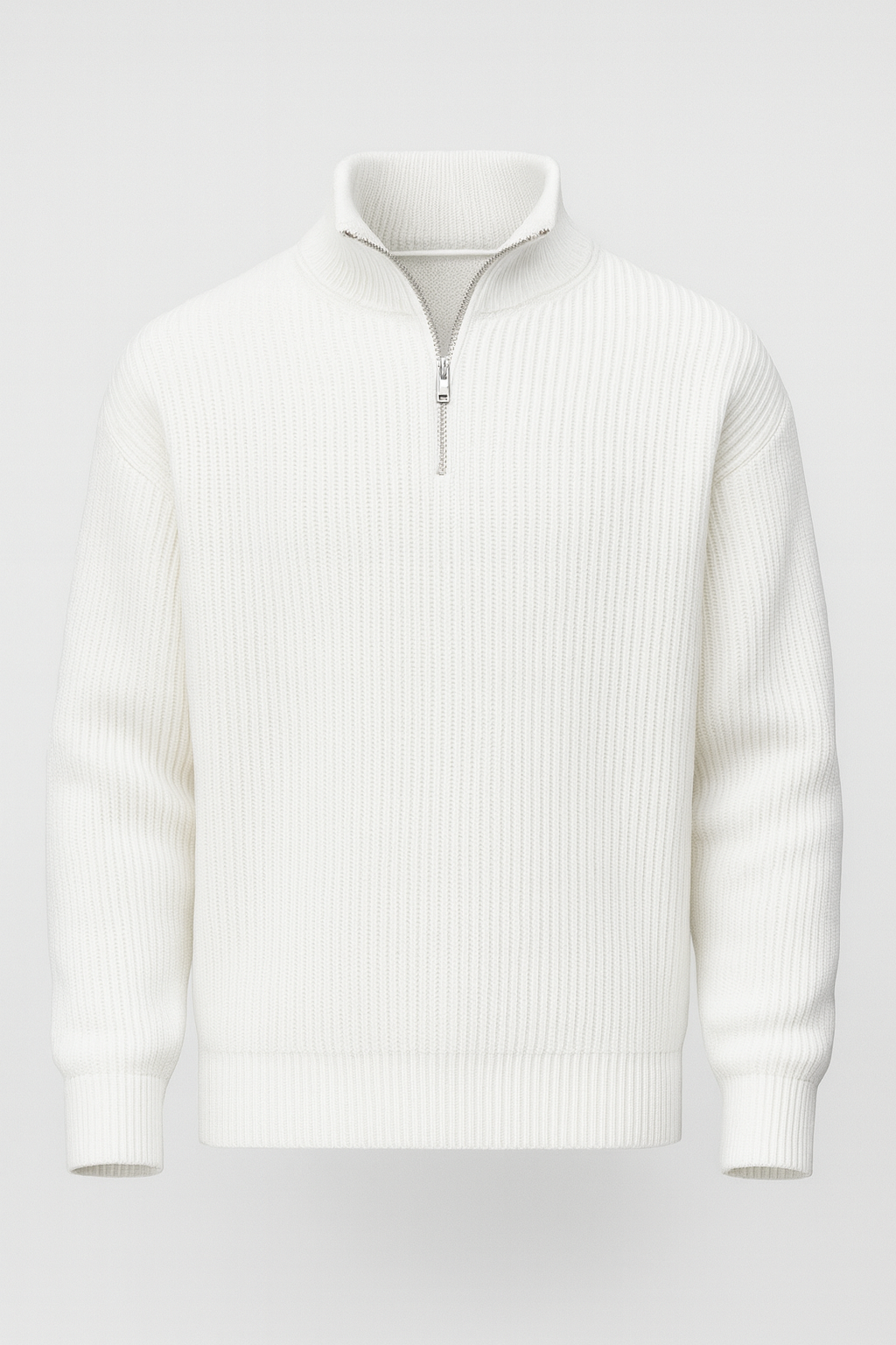 Oversize Selanik Örgü Yarım Fermuar Erkek Triko Kazak - Ekru