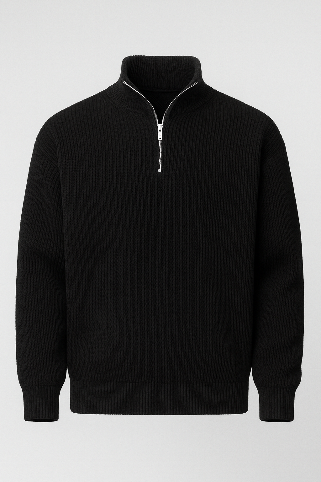 Nolan Oversize Selanik Örgü Yarım Fermuar Erkek Triko Kazak - Siyah
