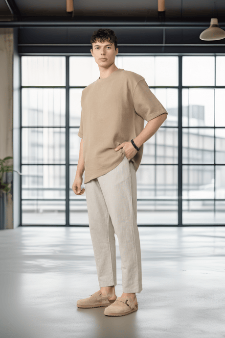 Pamuk Flamli  Rahat Kalıp  Düz Paça Jogger Erkek Pantolon - Bej