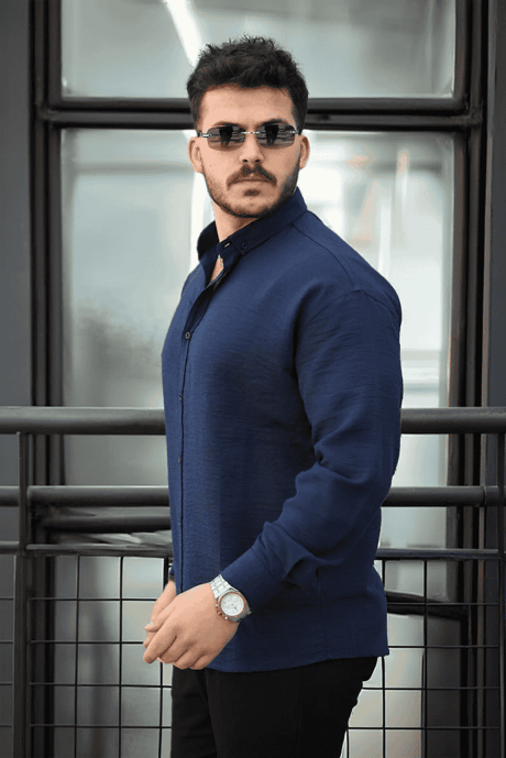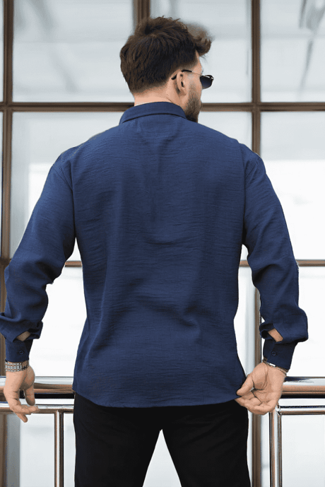 Pera Kumaş Keten Görünümlü Yarım Oversize Uzun kollu Erkek Gömlek - Lacivert
