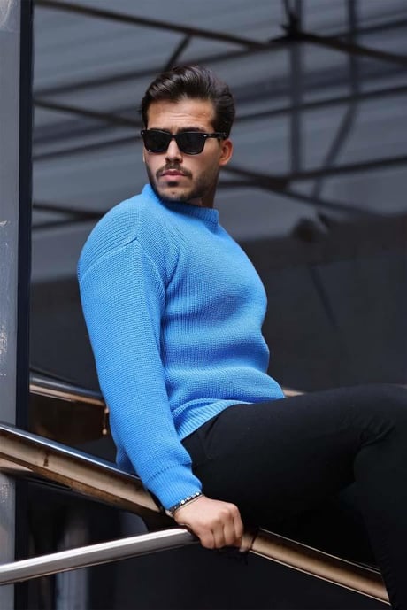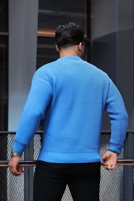 Selanik Örgülü Bisiklet Yaka Erkek Triko Kazak - Açık Mavi