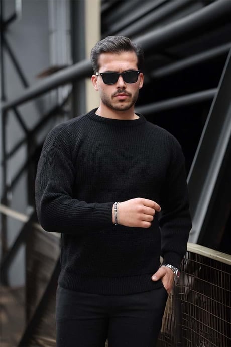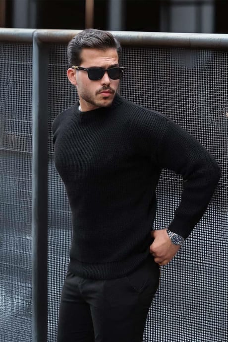 Selanik Örgülü Bisiklet Yaka Erkek Triko Kazak - Siyah