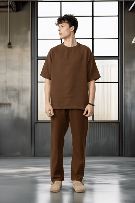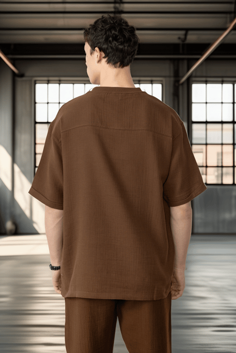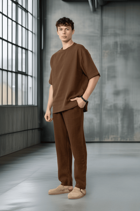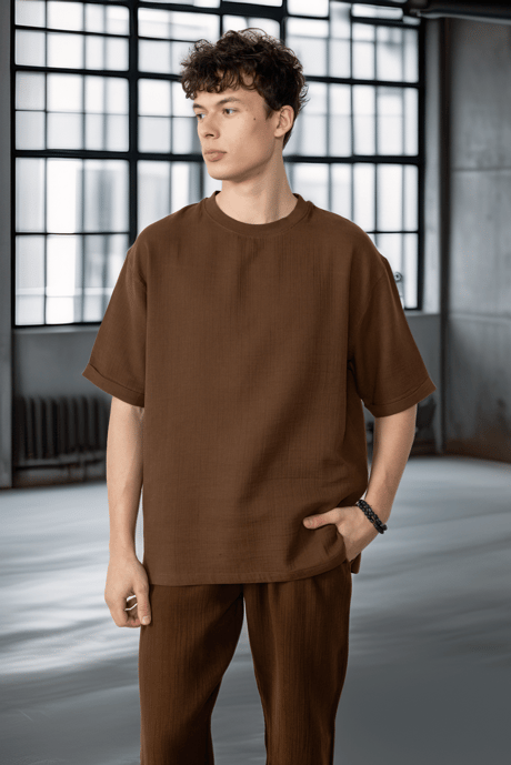 Rahat Kalıp Müslin Kumaş Erkek T-Shirt - Kahve