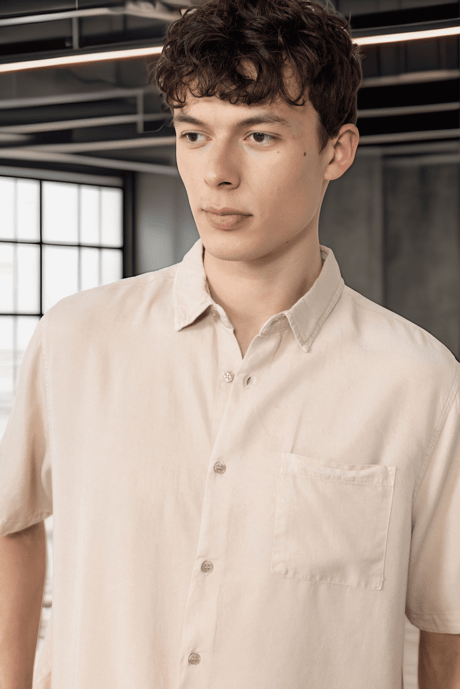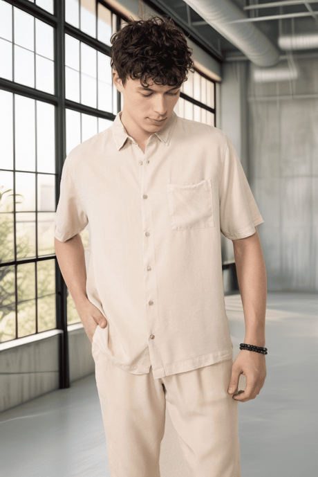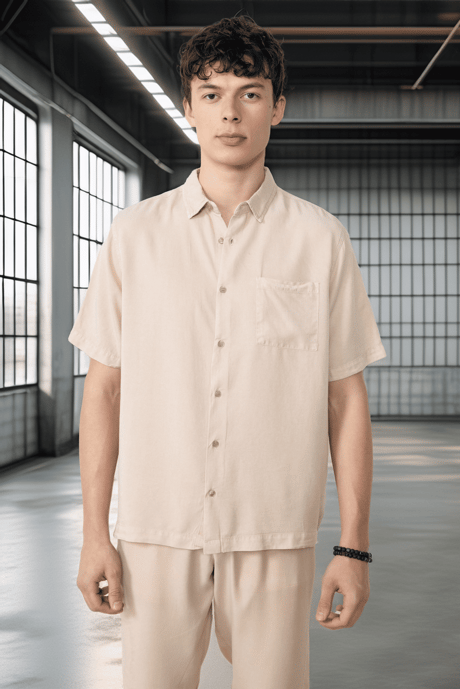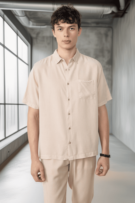 Tek Cepli Pamuk Kumaş Doğal Dokulu Oversize Erkek Gömlek - Bej