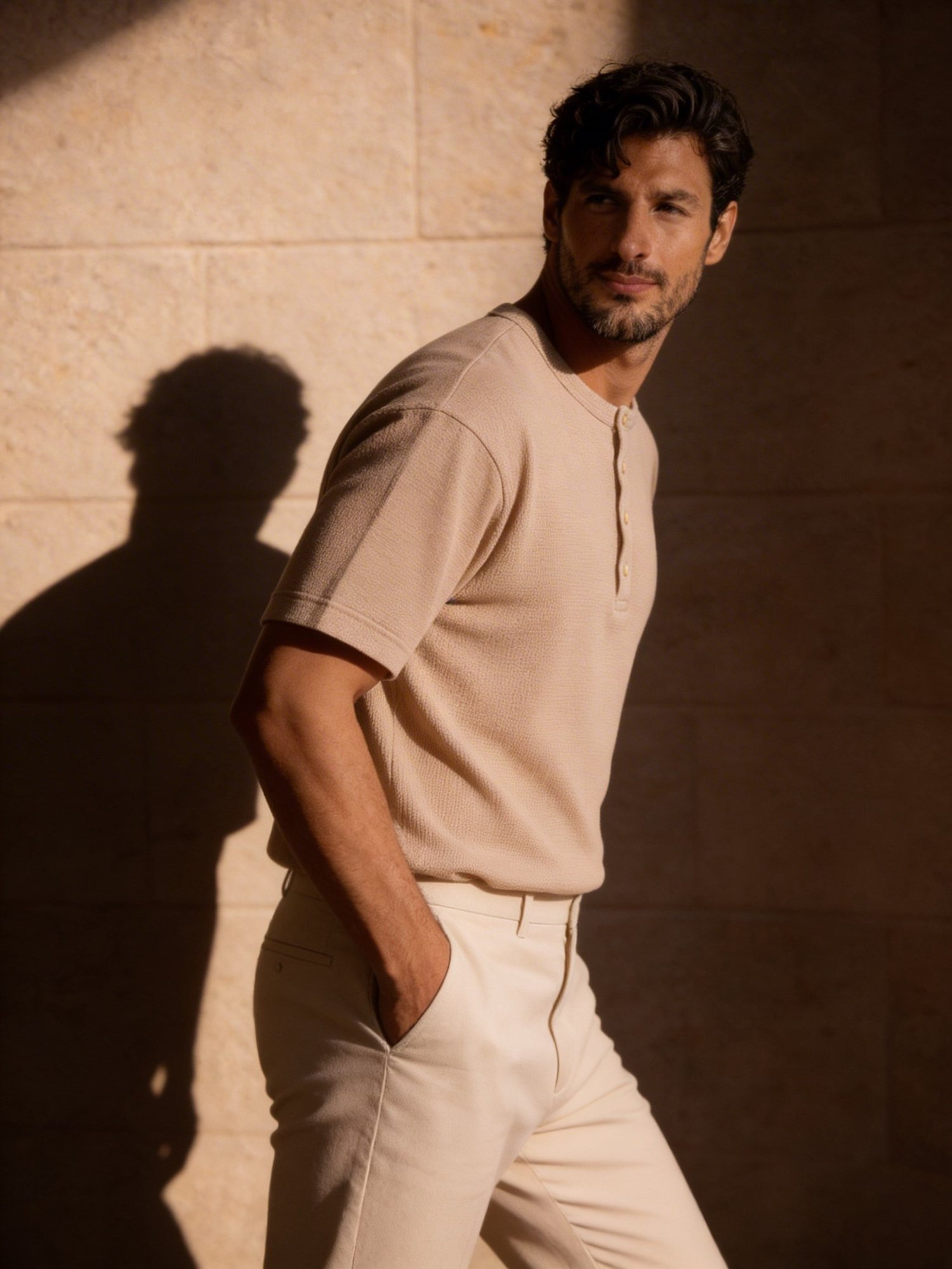 Roth Relaxed Fit Henley Yaka T-Shirt, yaz sezonu için tasarlanmış, modern ve zamansız bir basic parçadır. Mikro waffle dokulu kumaşı sayesinde hem nefes alır hem de yüzeyinde doğal, premium bir tekstür sunar. 4 düğmeli henley yaka detayı klasik bisiklet yakaya göre daha karakterli bir görünüm kazandırır. Relaxed fit kalıbı ise omuzdan doğal düşüş sağlar; vücuda yapışmaz, rahat ama salaş olmayan dengeli bir siluet oluşturur. Mat yüzeyli, küçük kare hücreli waffle/pike benzeri dokusu ürüne hacim kazandırırken yazlık hafif gramajı sayesinde gün boyu konfor sunar. Günlük kombinlerden akşam şehir stiline kadar geniş kullanım alanına sahiptir. ✦ Kumaş Özellikleri Mikro waffle / pike benzeri dokulu yüzey Nefes alan yazlık hafif gramaj Mat ve doğal görünüm Form tutan, tok duruş Cilt dostu yumuşak tuşe ✦ Kalıp Bilgisi Relaxed Fit Omuzdan doğal düşüş Kısa kollu 4 düğmeli henley yaka ✦ Kombin Önerisi Keten pantolon ile yazlık smart-casual kombin Kanvas veya jogger pantolon ile günlük şehir stili Minimal sneaker veya loafer ile tamamlanabilir Renk seçenekleri: Siyah, Füme, Bej, Vizon, Ekru Beden aralığı: S – M – L – XL – XXL