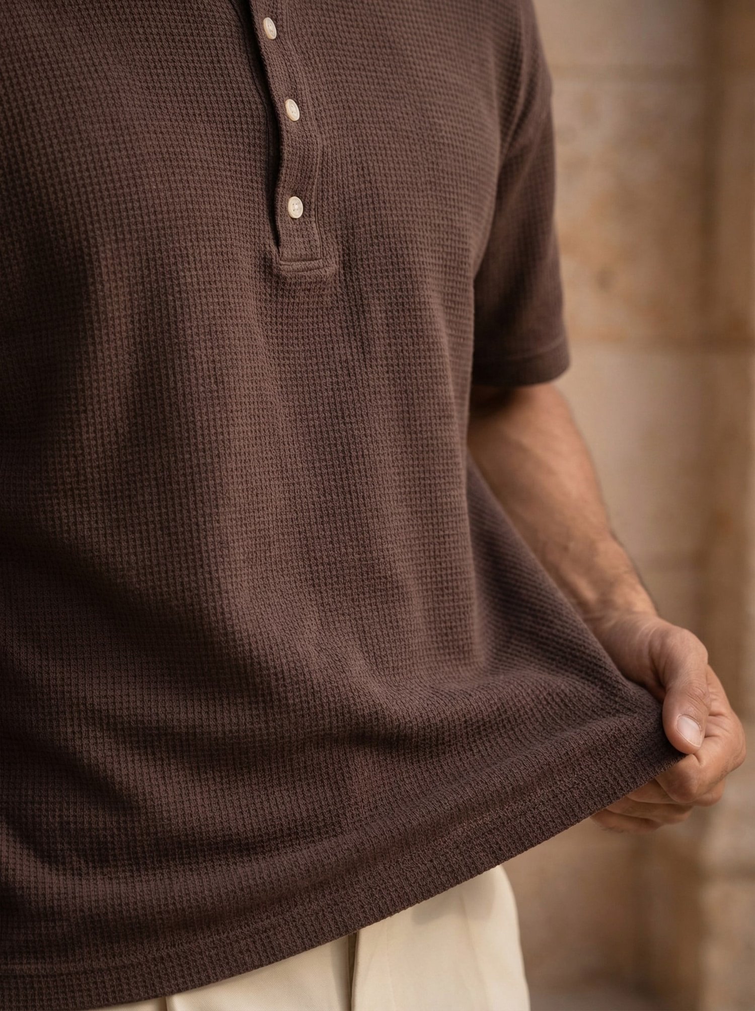 Roth Relaxed Fit Günlük Henley Yaka Waffle Kumaş Yazlık Kısa Kollu T-Shirt - Vizon