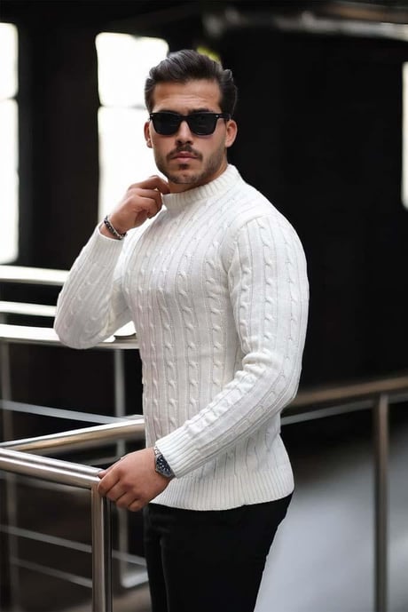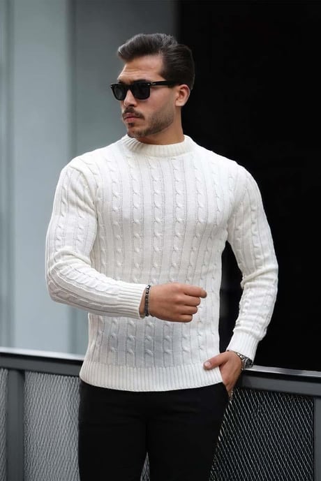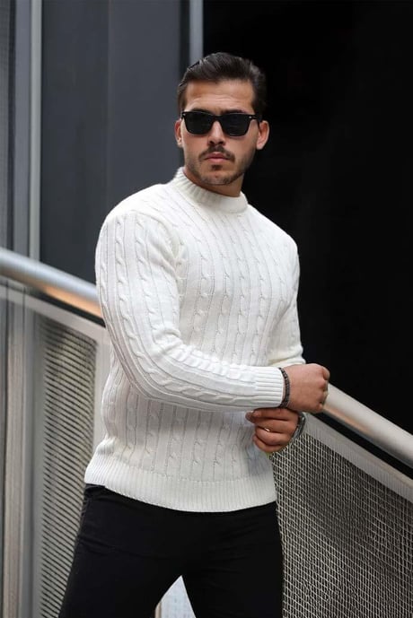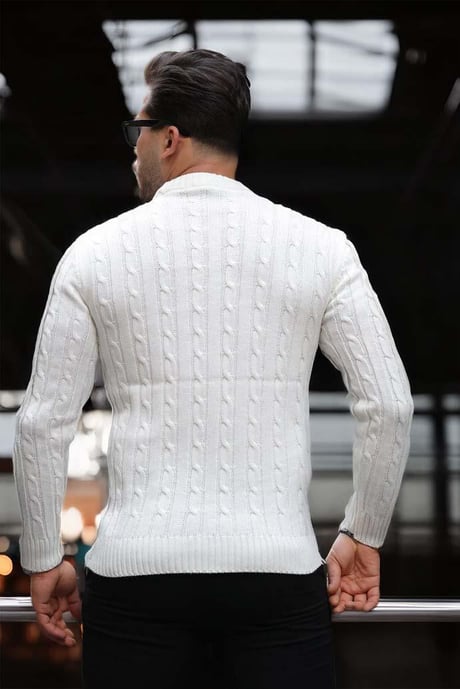 Saç Örgülü Bisiklet Yaka Erkek Triko Kazak - Beyaz