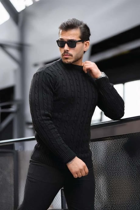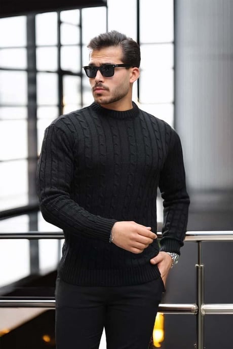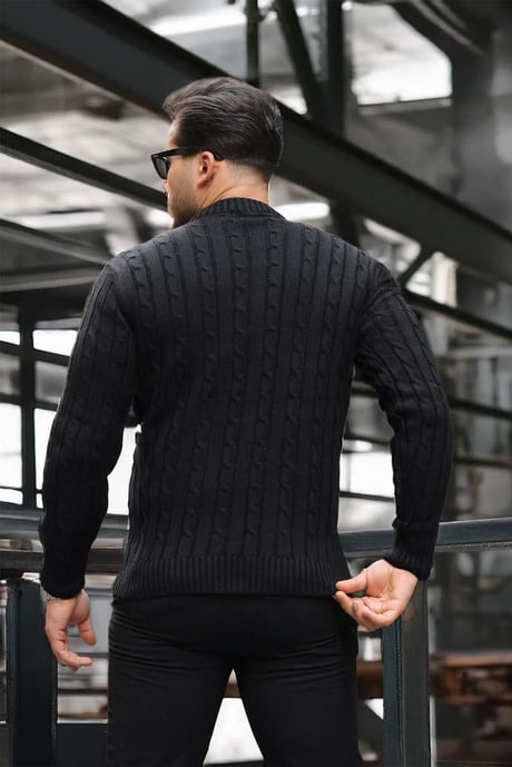 Saç Örgülü Bisiklet Yaka Erkek Triko Kazak - Siyah