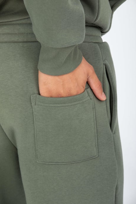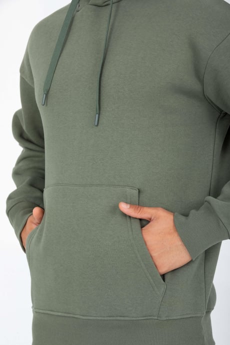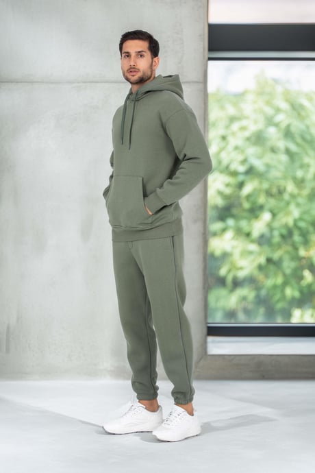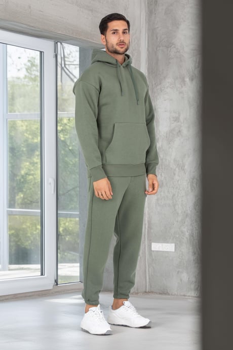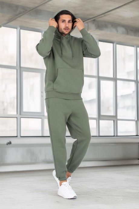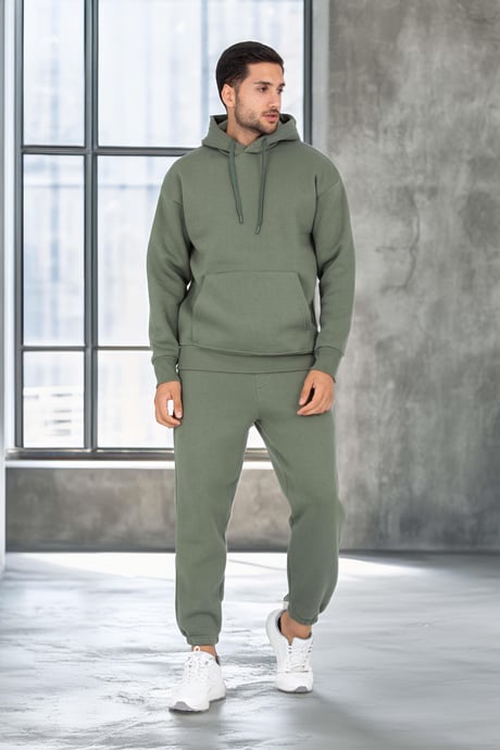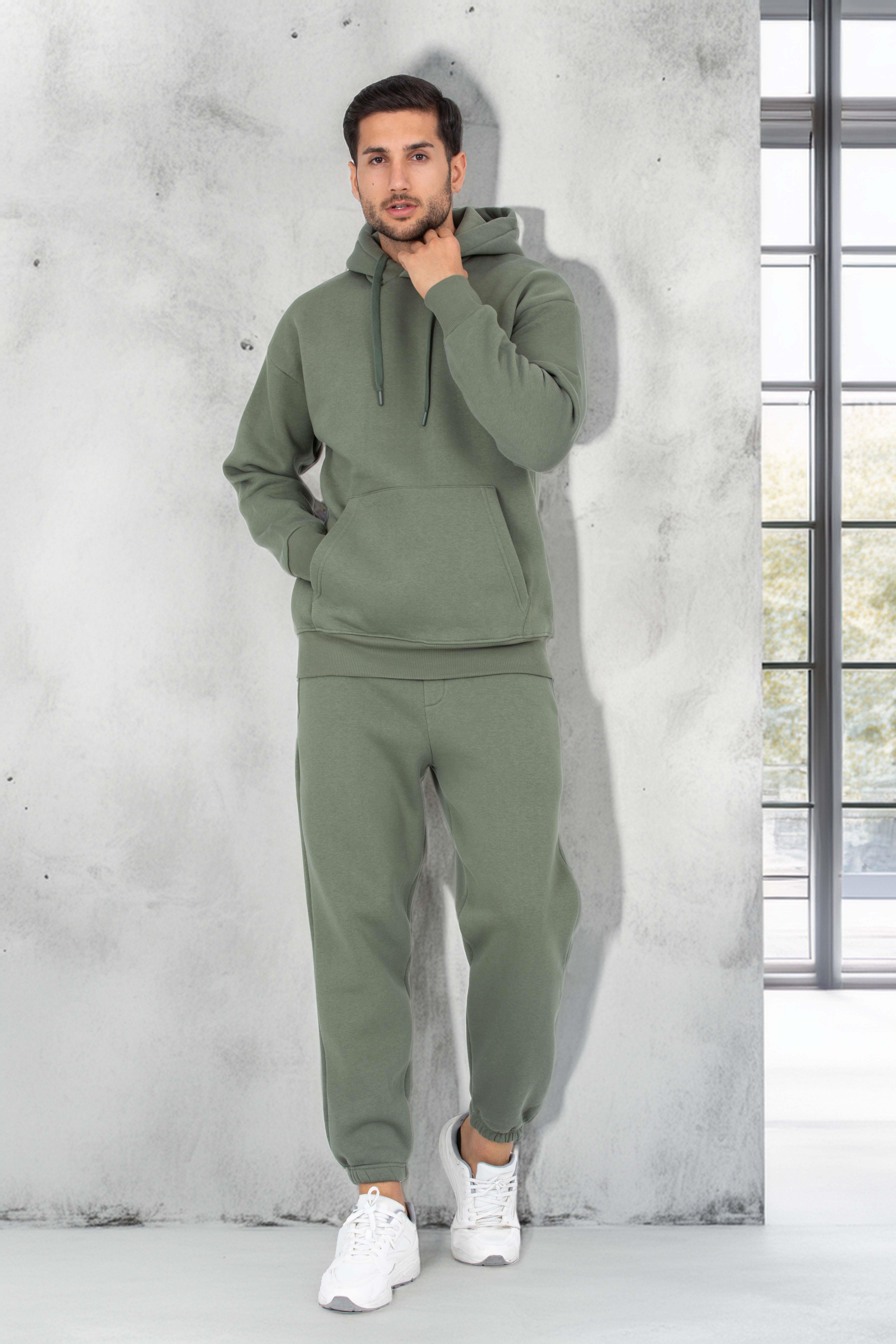 Şardonlu Kanguru Cepli Sweatshirt - 3 İplik Şardonlu Lastik Paça Erkek Eşofman Altı- Eşofman Takımı - Avcı Yeşili
