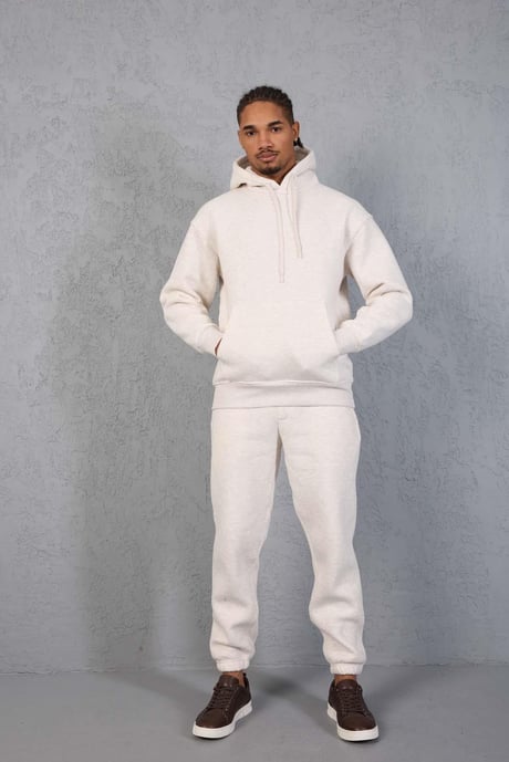 Şardonlu Kanguru Cepli Sweatshirt - 3 İplik Şardonlu Lastik Paça Erkek Eşofman Altı- Eşofman Takımı - Bej