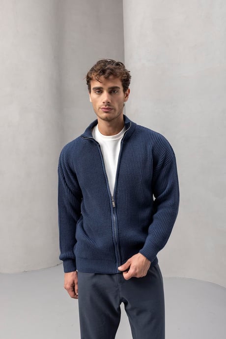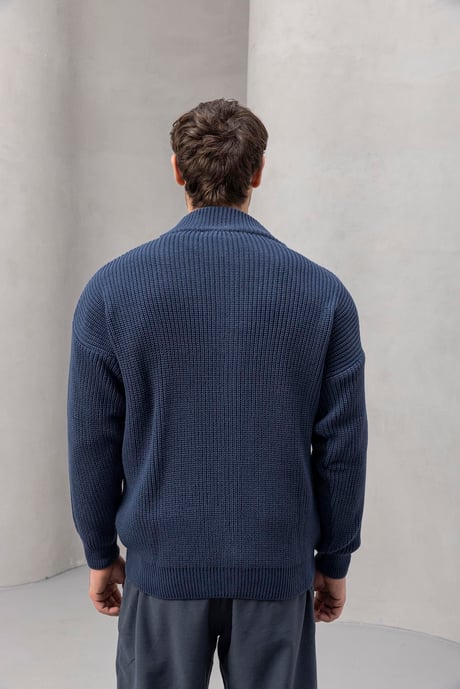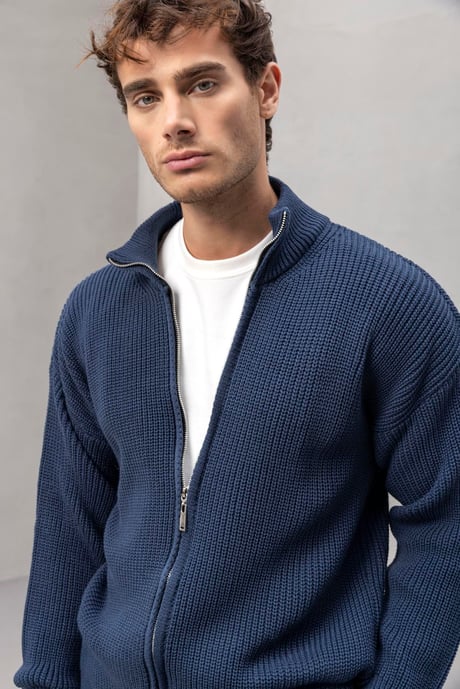 Oversize Selanik Örme Fermuarlı Erkek Hırka- İndigo