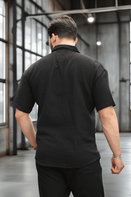 Yarım Oversize Apaş Yaka Kısa Kol Müslin Kumaş Erkek Gömlek - Siyah