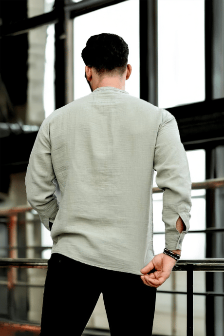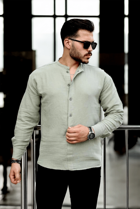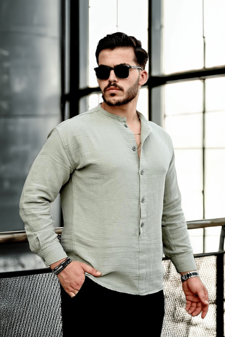 Hafif ve Nefes Alabilir Erkek Müslin Yarım Pat Hakim Yaka Oversize Gömlek - Açık Haki