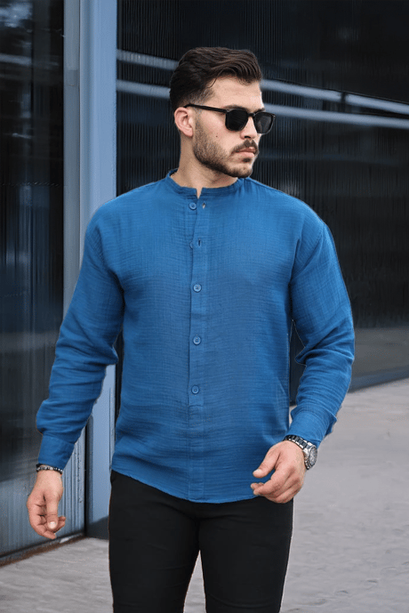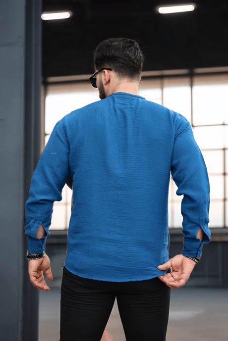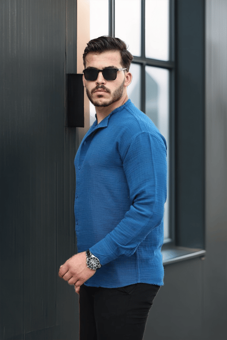 Hafif ve Nefes Alabilir Erkek Müslin Yarım Pat Hakim Yaka Oversize Gömlek -İndigo