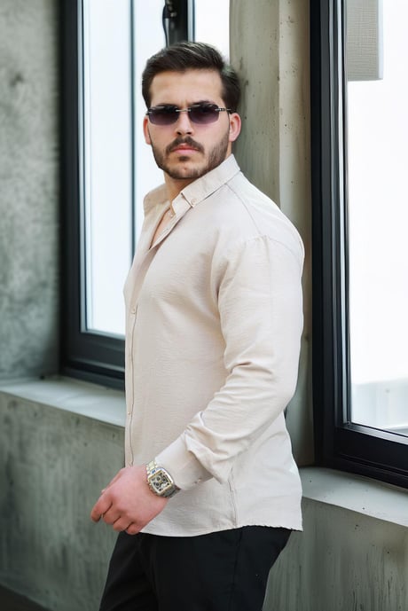 Yumuşak Dokulu Yarım Oversize Erkek Gömlek - Bej